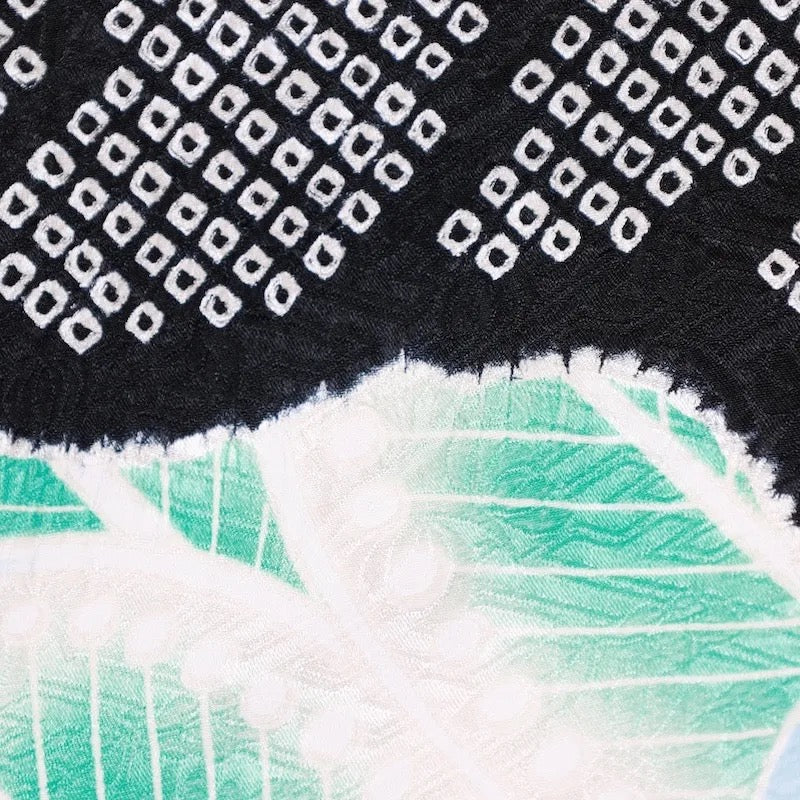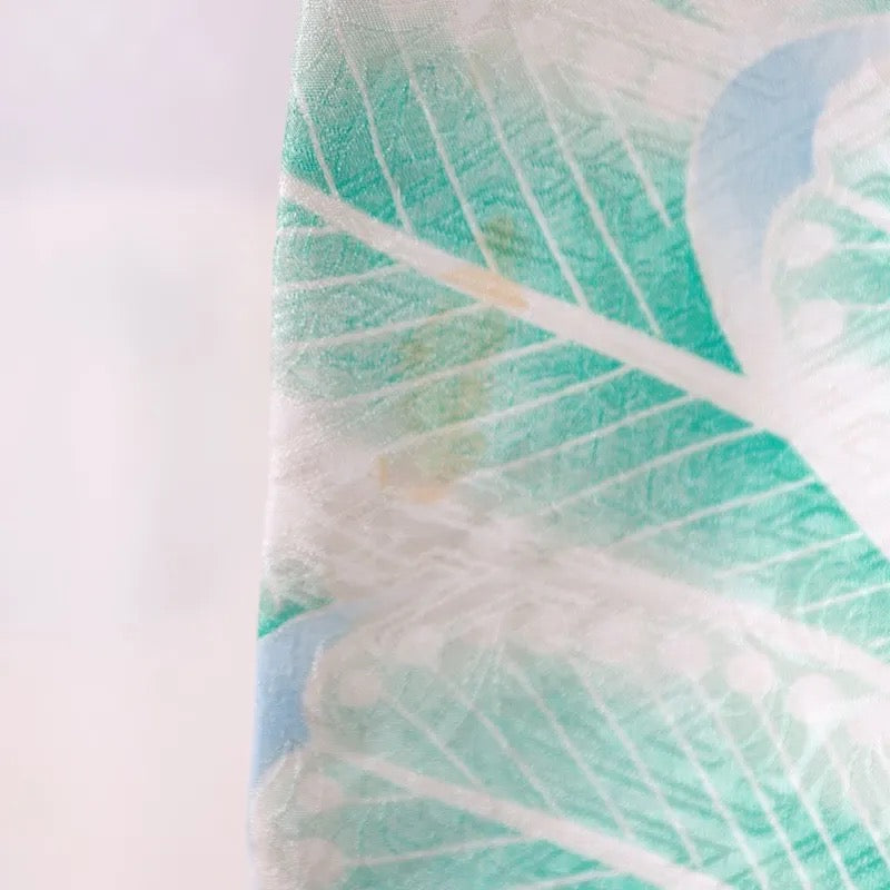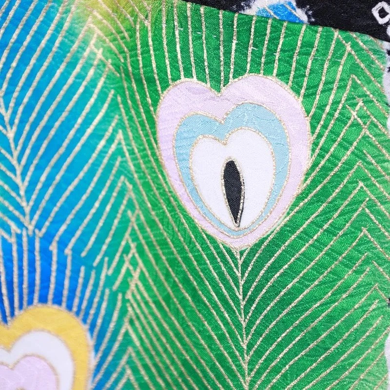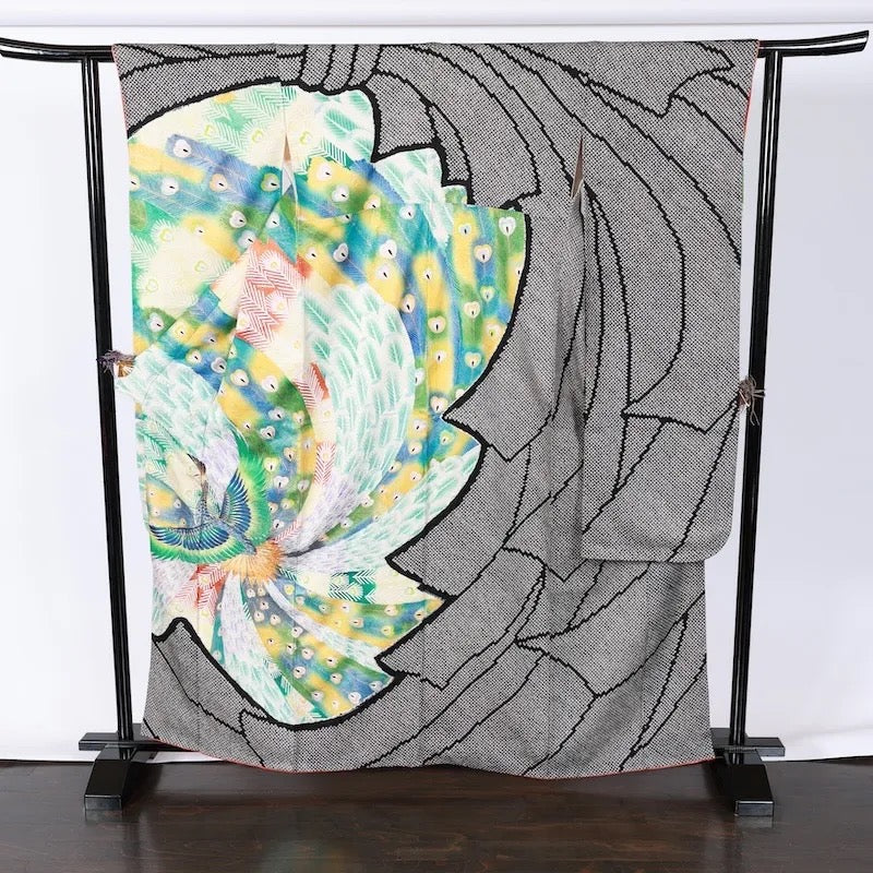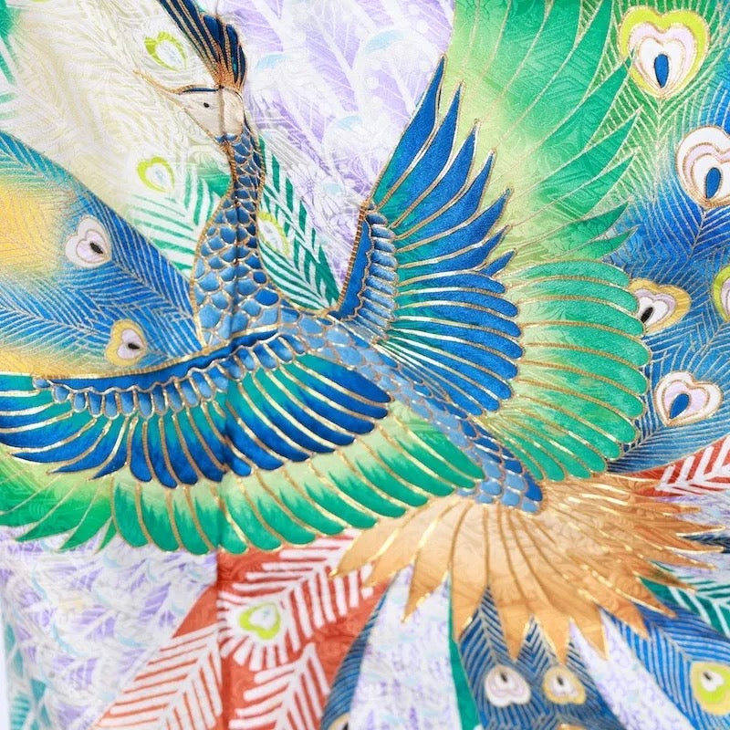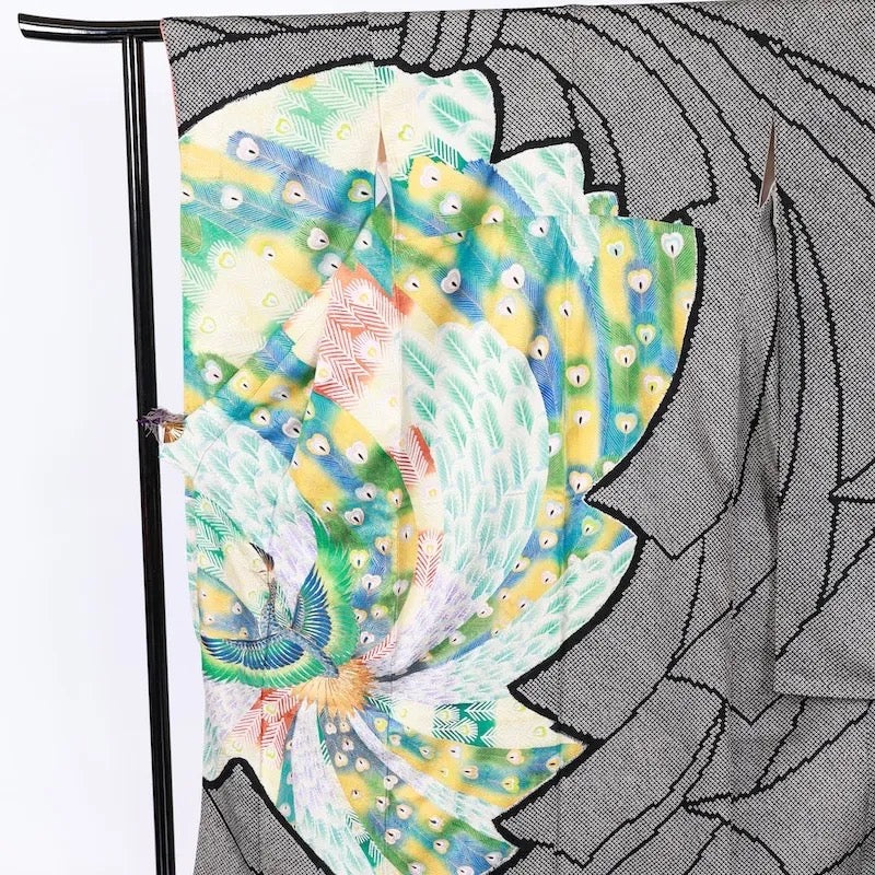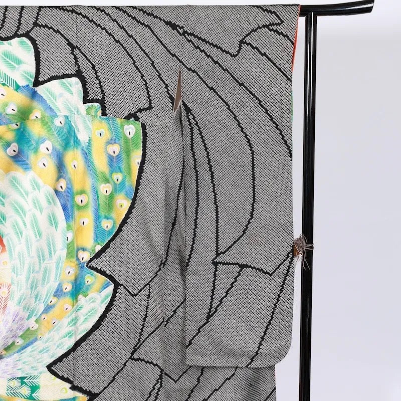 This wonderful item has been carefully hand-dyed by artisans using Hikita tie-dyeing on damask fabric, and beautifully dyed by Yuzen artisans with peacocks. Wear it stylishly to a fancy event.