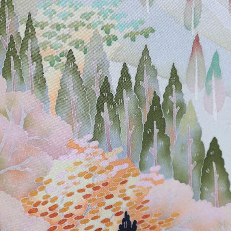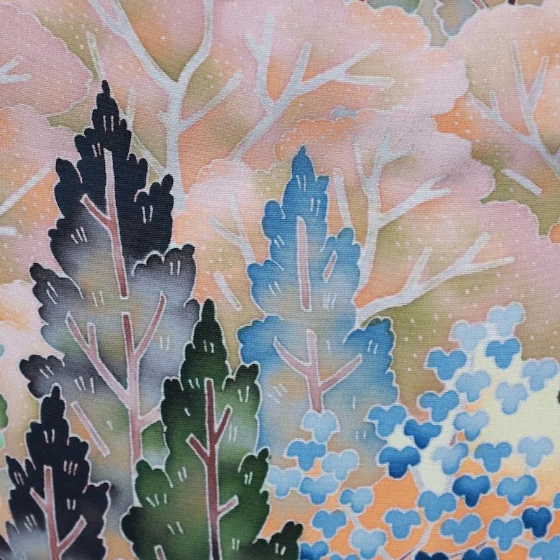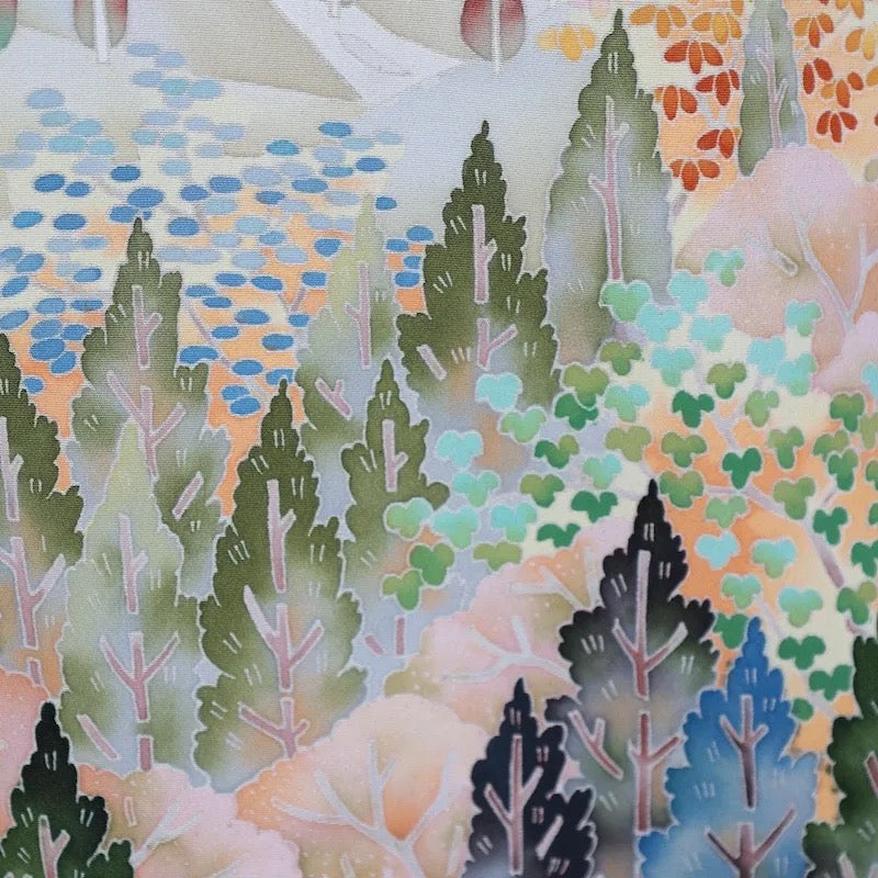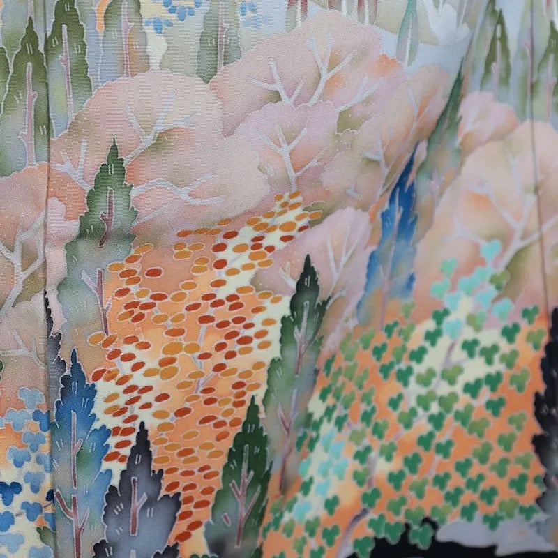 Enjoy the skill of this leading Kaga Yuzen dyer, a wonderful piece dyed by Ichiro Kakimoto to depict the original landscape of Mount Kurakake.