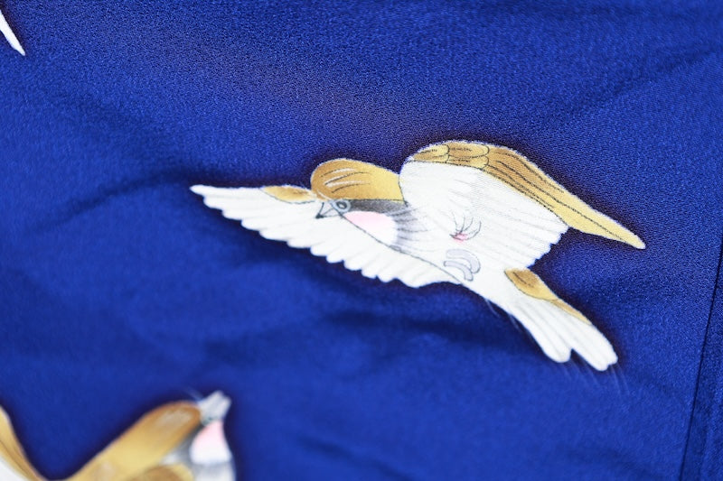 Wear this modern item with hand-dyed bamboo and sparrows in a bright blue color to a fancy event.