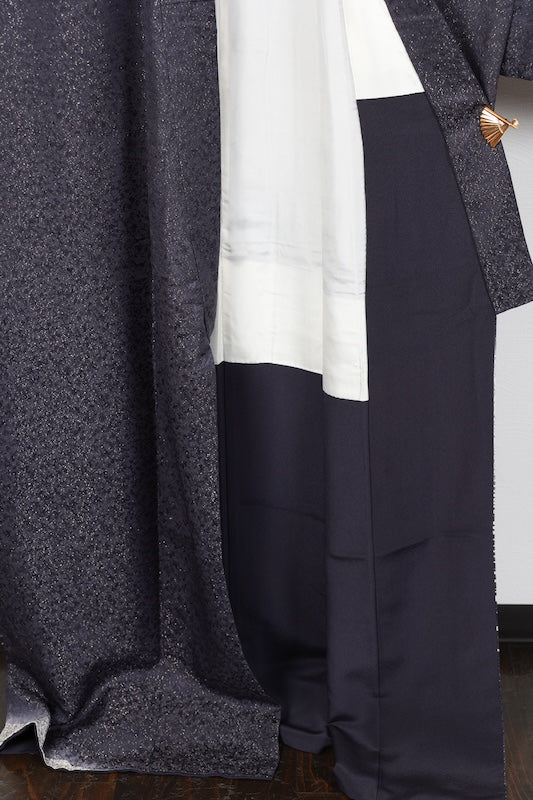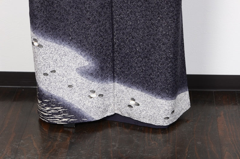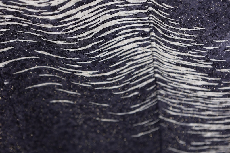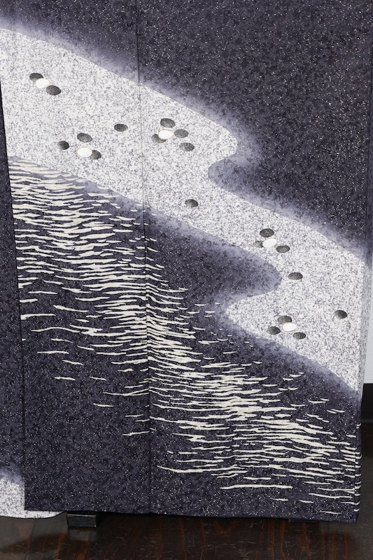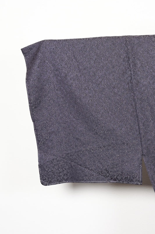 This is a lovely item with a noble purple background, gold threading, and hand-painted waves and abstract patterns.