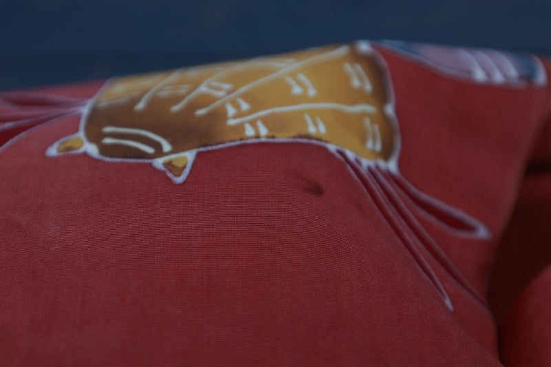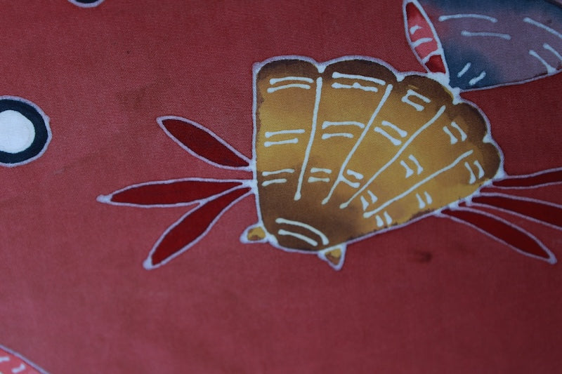 Wear this stylish bingata Nagoya obi, hand-dyed using 20 stencils of waves, shells, and flowers on a tsumugi fabric in stylish colors, and head out in style.