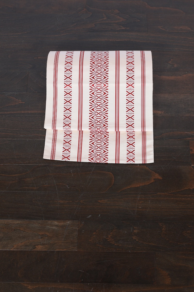 This is a lovely item with a crisp, formal pattern woven into a soft off-white background.