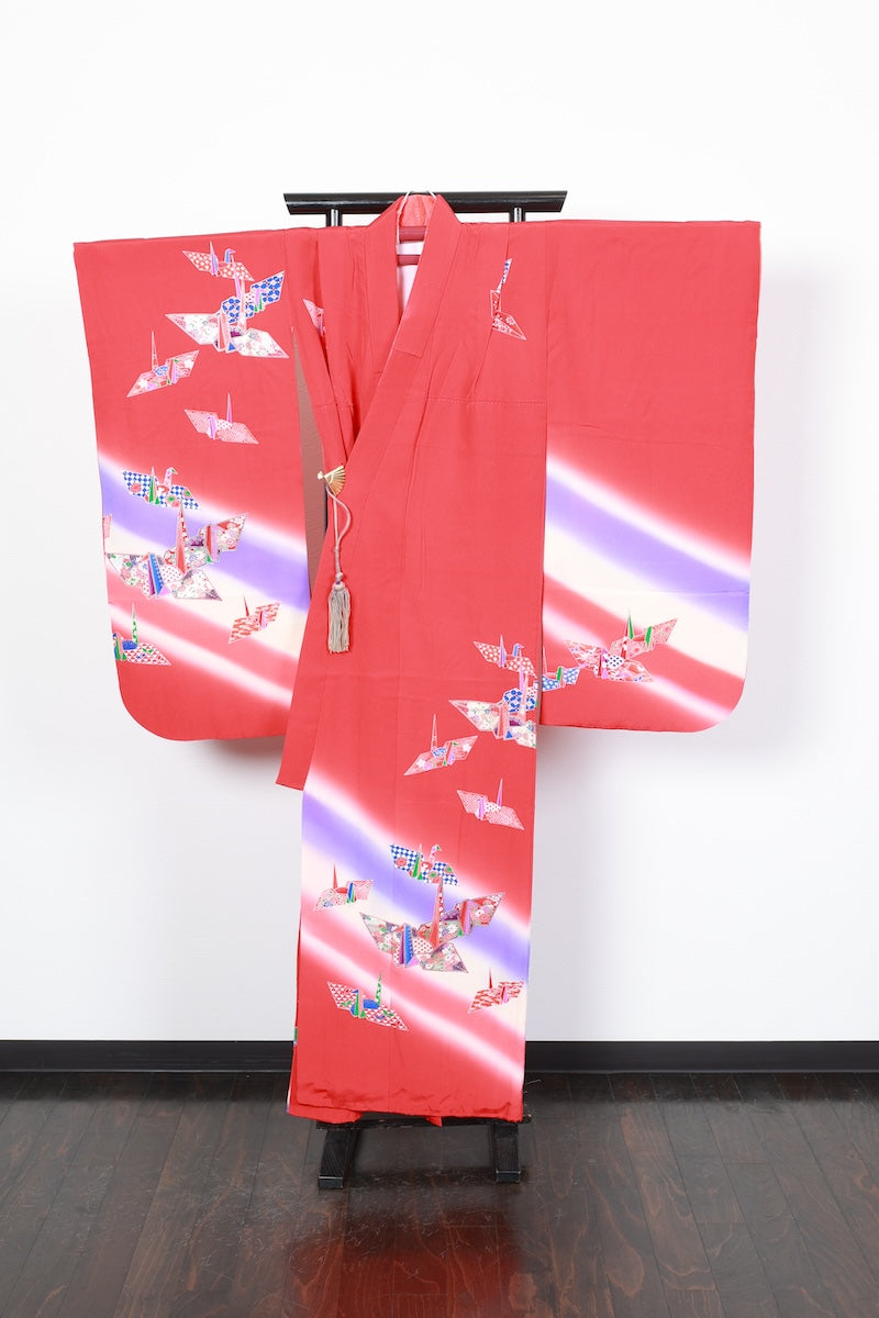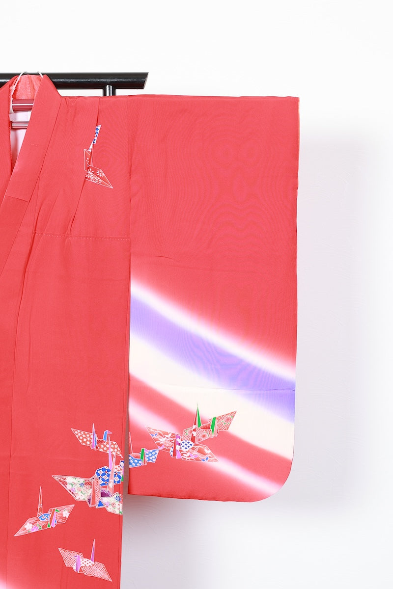 This is a retro item from the 1970s, hand-dyed Kyoto Yuzen with cranes, butterflies, flowers, and Seigaiha patterns on a cute red base.