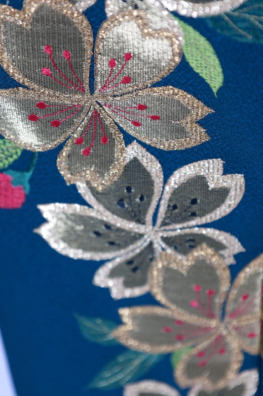 This modern furisode (long-sleeved kimono) features cherry blossom embroidery on an emerald green background. Please wear it stylishly on your way out.