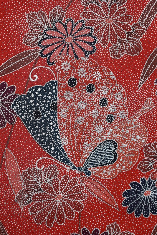 This gorgeous furisode (long-sleeved kimono) has a stylish red base and is hand-dyed with gold tapping, tachibana, cherry blossoms, flower baskets, and butterflies with gold paste type eyes in a gold piece process. Please wear it stylishly on a gorgeous occasion.