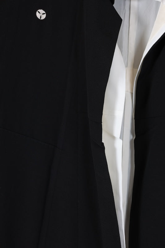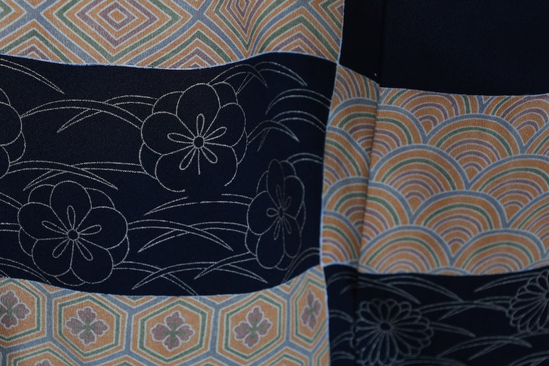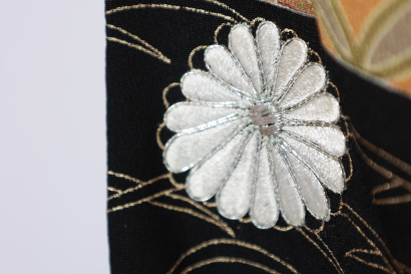 Black formal kimono used (Kurotomesode) - Gold, Green, Beige, Ochre, Blue - Pine, Five-part chrysanthemum crest, Seigaiha wave pattern, Shippo pattern, Dewdrop grass, Chrysanthemum, Gold thread embroidery, Kyo-Yuzen dyeing - J3