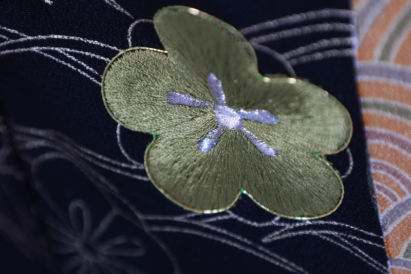 Please wear this beautiful Kyoto Yuzen kimono, featuring auspicious patterns hand-embroidered, with gold thread embroidery and hand-painted details, to your next formal occasion.