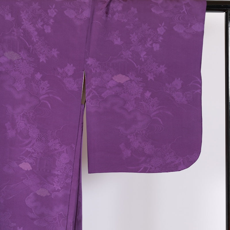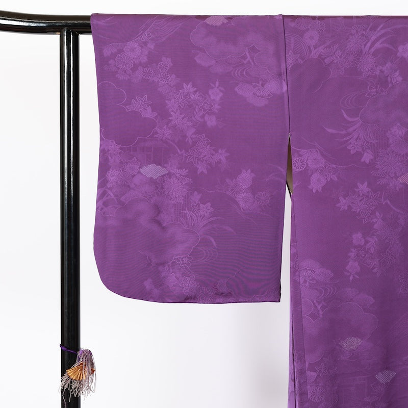 This elegant purple kimono features flowers and clouds in a traditional Chinese weave pattern. Wear it over your clothes and enjoy the stylish look.