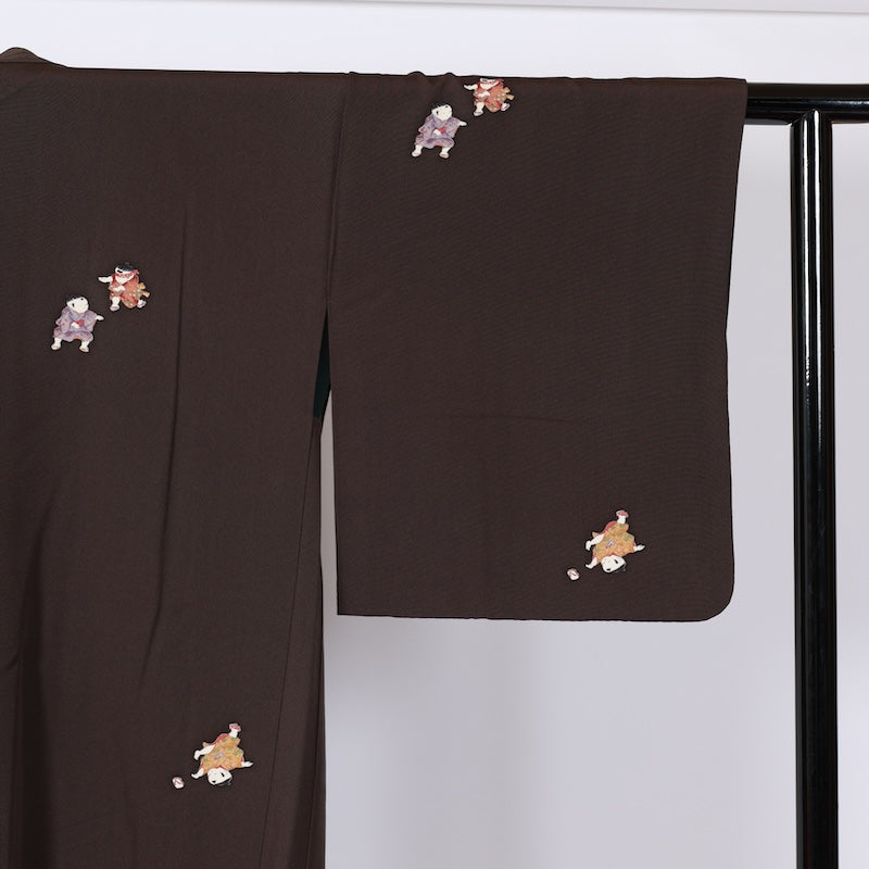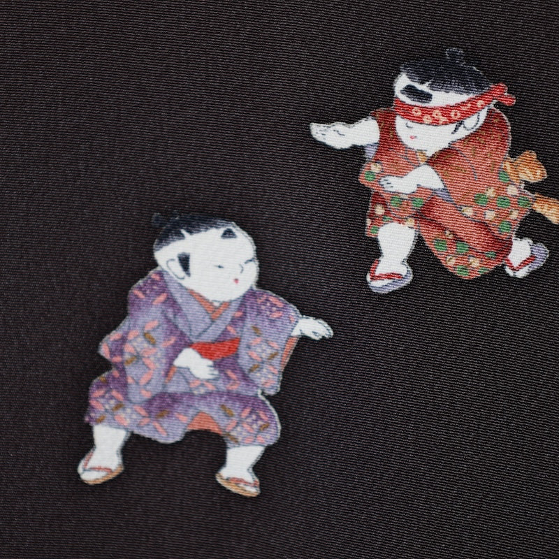 This is a hand-painted Kyoto yuzen kimono featuring a child dyed on a stylish black base. It also looks great worn over other clothes. It comes with a feather cord.