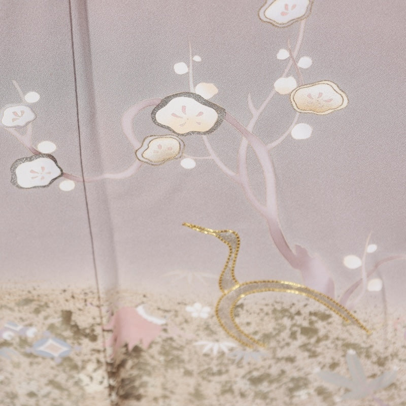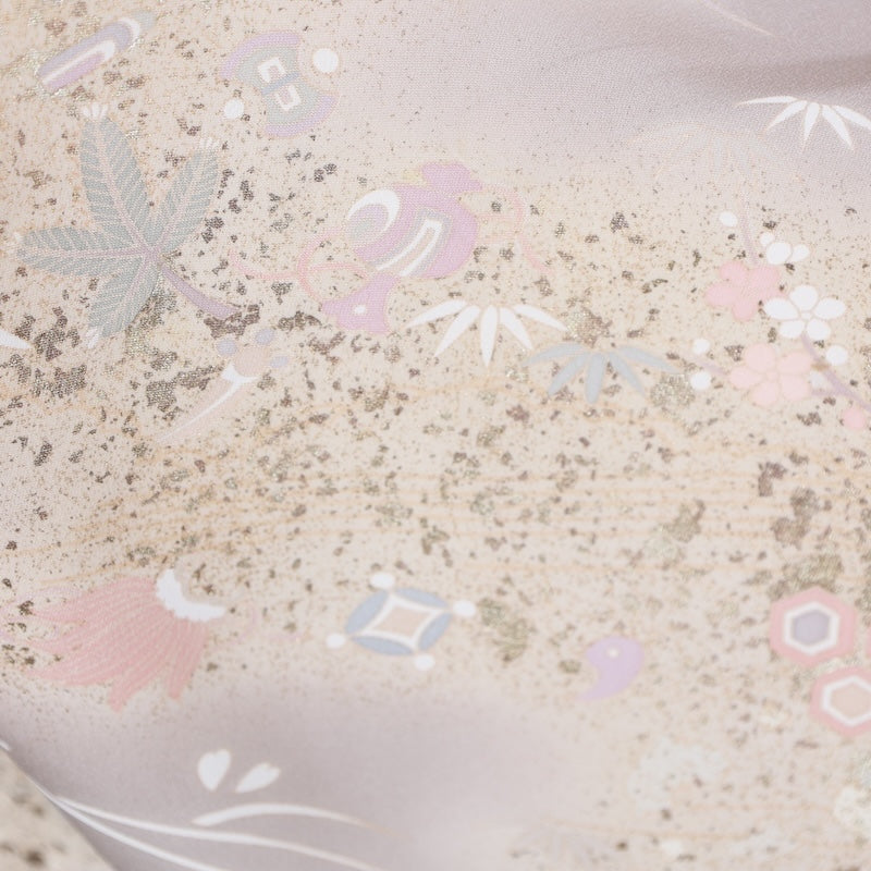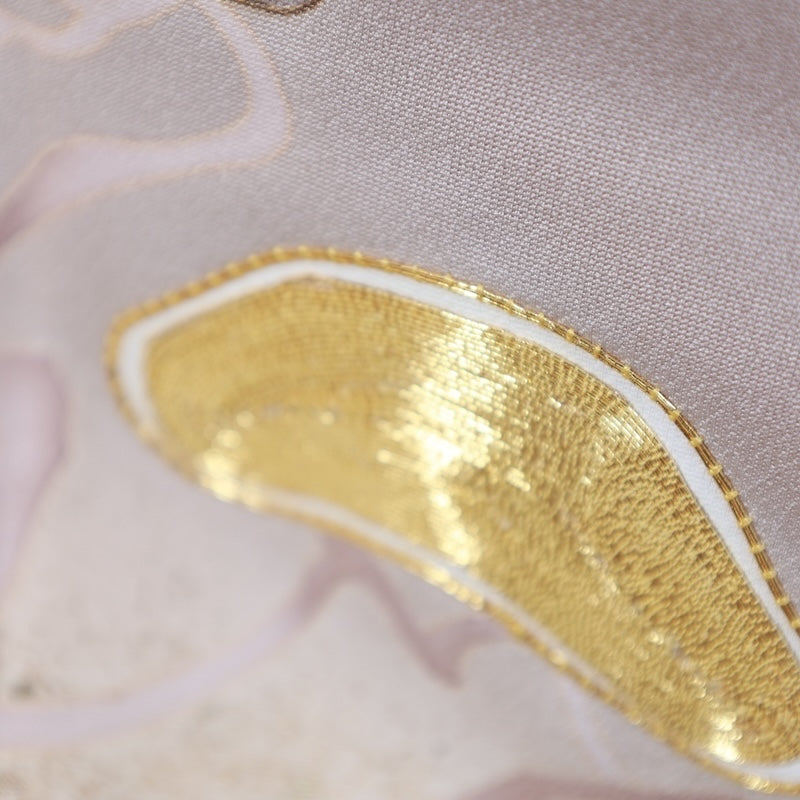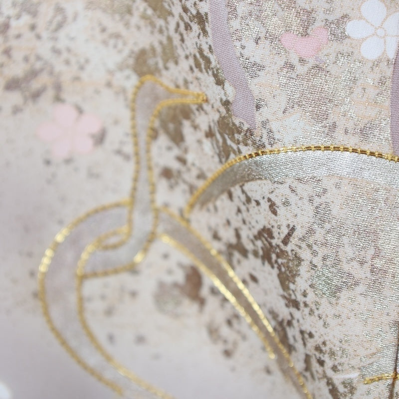 Wear this stylish hand-painted Kyoto Yuzen fabric, which has a brownish gray base with gold thread processing, glue threads, and auspicious patterns dyed with a hammered technique, and head out to a fancy event.