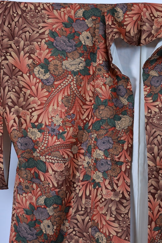 Wear this lovely item, dyed with Tsujigahana flowers on a stylish brown base, and look stylish when you go out.