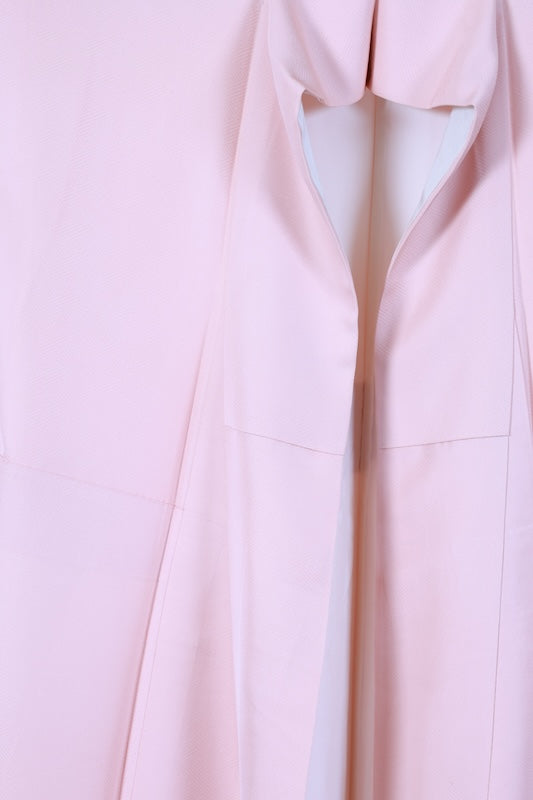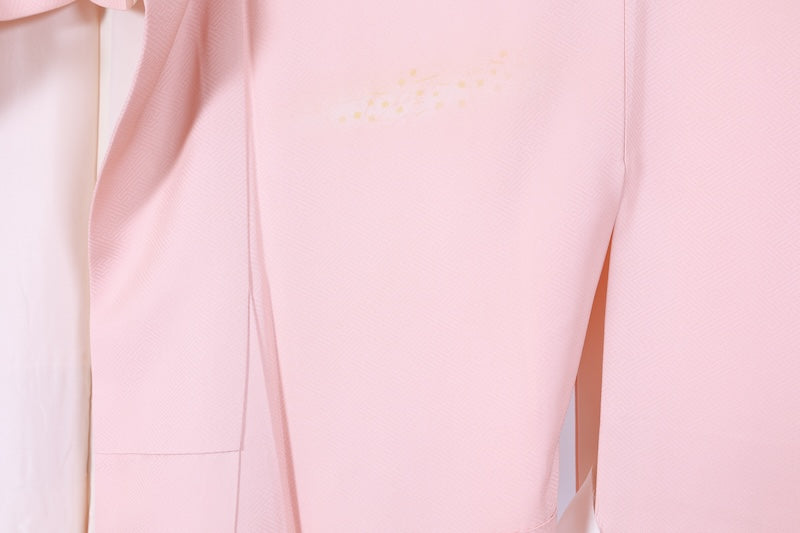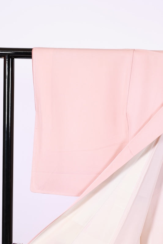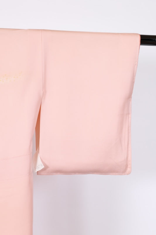 Go out looking stylish in this lovely Kyoto Yuzen kimono, which has a Sayagata pattern and a soft cherry blossom color dyed on the front kimono, with hand-embroidered and hand-painted flowers.