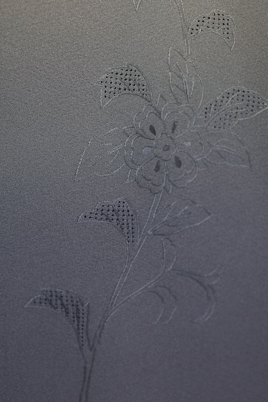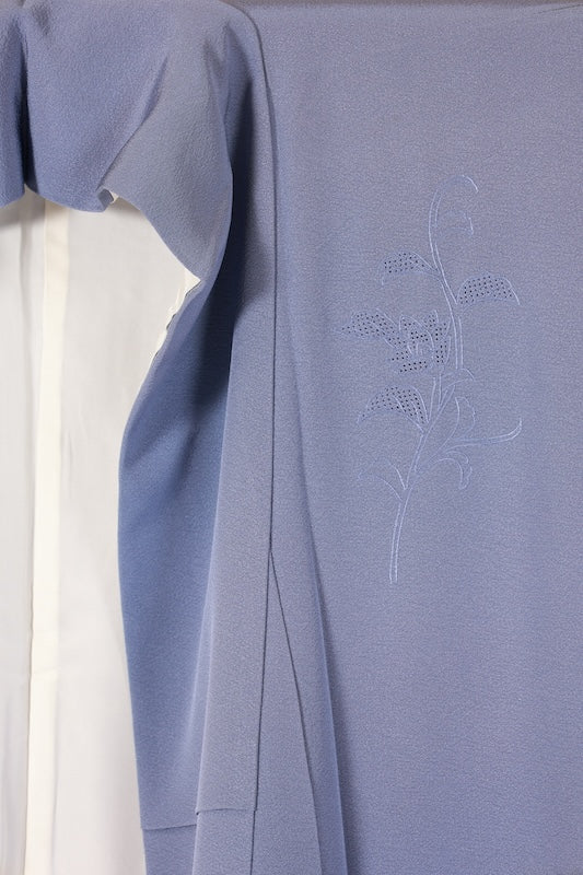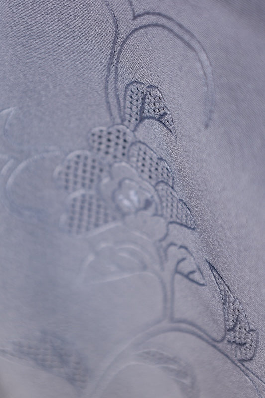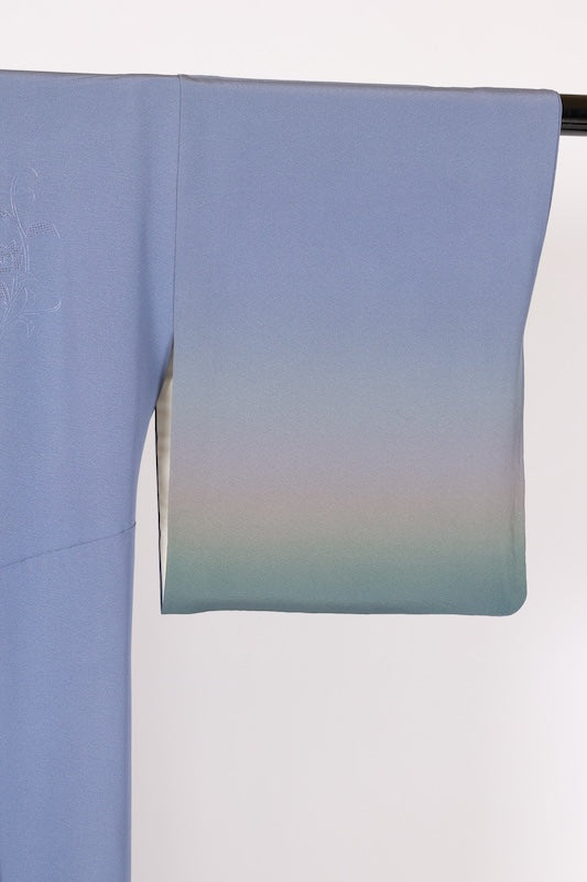 Party kimono in light purple, green, and gray with floral and Shantou embroidery