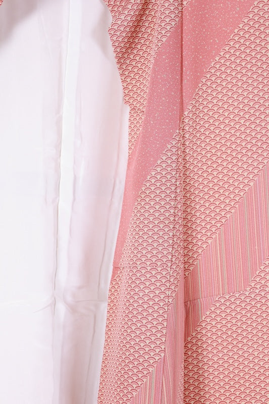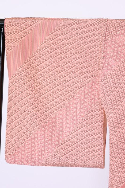 Edo Komon Tsukesage (small patterned kimono) in brown and coral with Seigaiha (wave) and hemp leaf patterns. Crafted by Teruhisa Tajima.