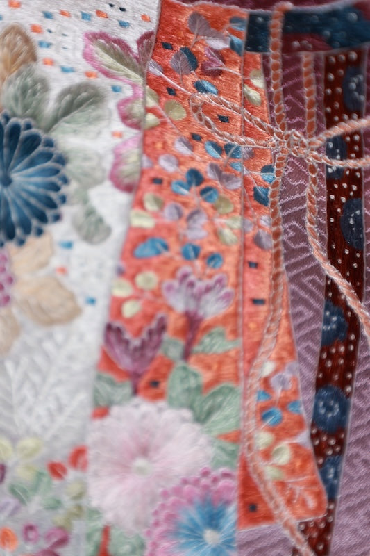 The fabric is sturdy with a saaya pattern, but the sleeve pattern has been meticulously embroidered stitch by stitch by an artisan, resulting in a stunning piece of handwork that is on the level of a work of art.