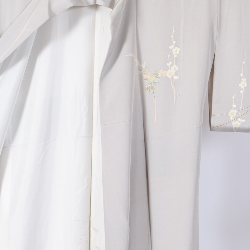 Enjoy the artist's hand-painted Kyoto Yuzen dyeing of plum blossoms and pine leaves on a stylish gray background for a stylish outing.