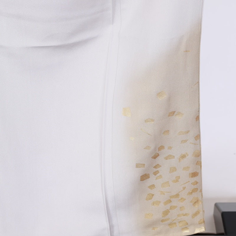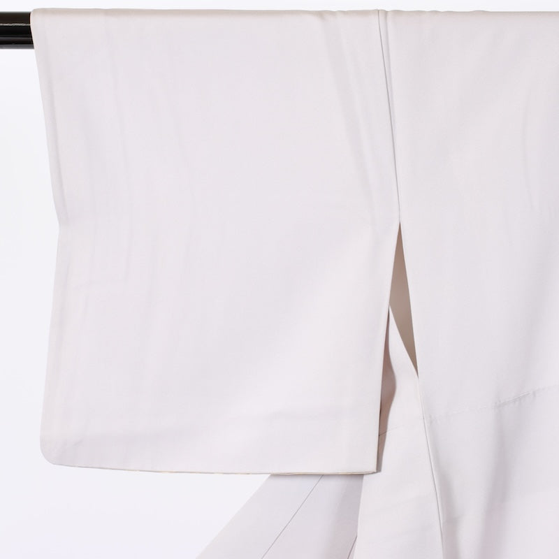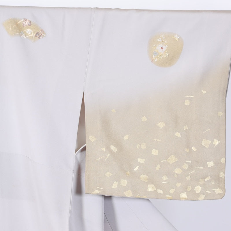 Go out looking great in this elaborate Kyoto yuzen, which has a stylish gray base, split bamboo to prevent dyeing, and then hand-dyed in elegant shades of muddy gold, with flowers embroidered by another artisan.
