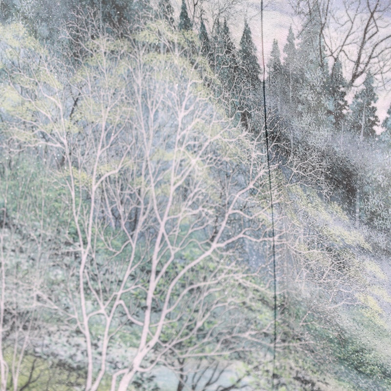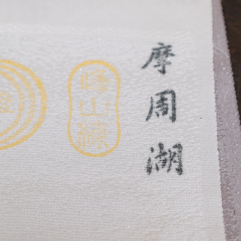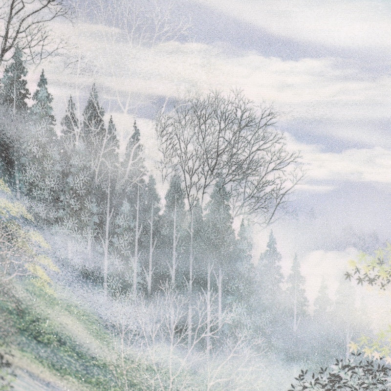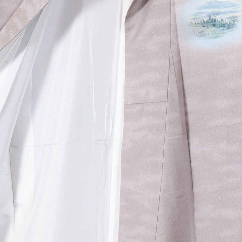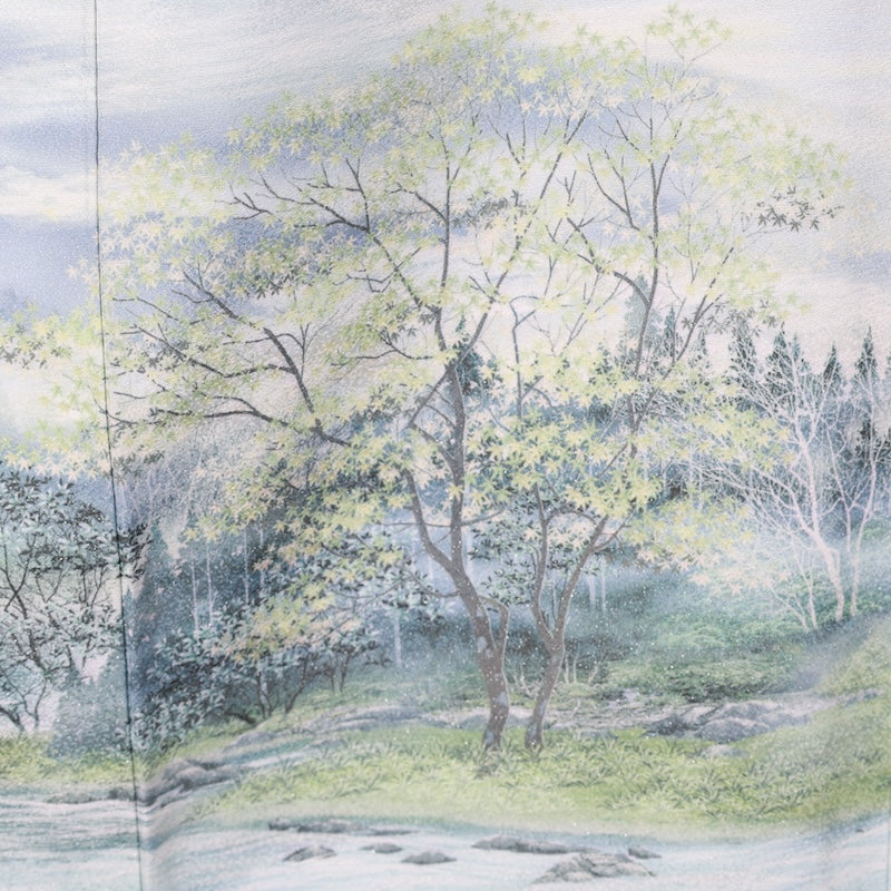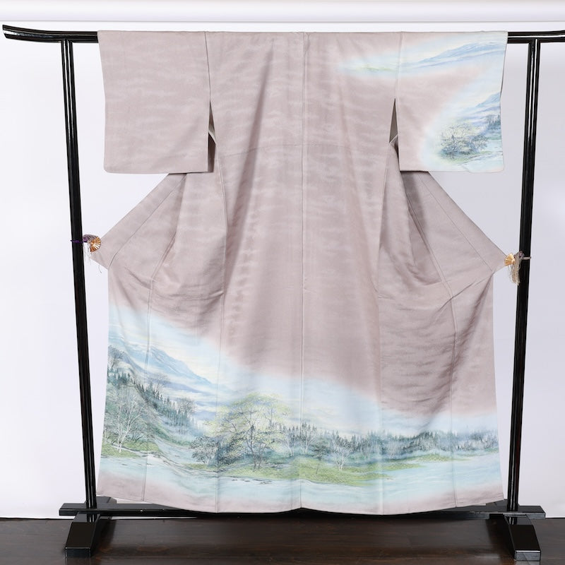 Go out looking stylish in this hand-painted Kyoto Yuzen kimono, featuring a stylish grey base with silver threads and a landscape of Lake Mashu.