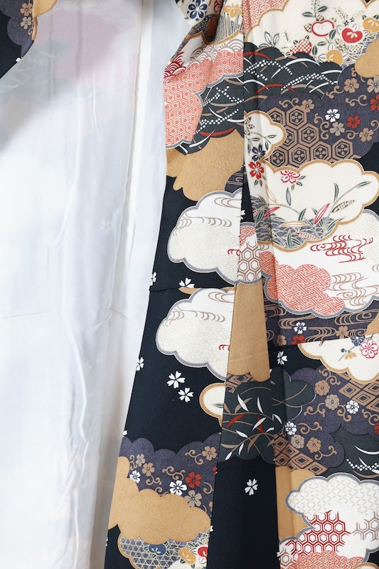 Wear this beautiful Kyoto Yuzen kimono from the 1970s in a retro-modern style, with a basic black base and hand-dyed auspicious patterns of clouds, mandarin oranges, tortoiseshell patterns, dew grass patterns, waves, and cloisonne.