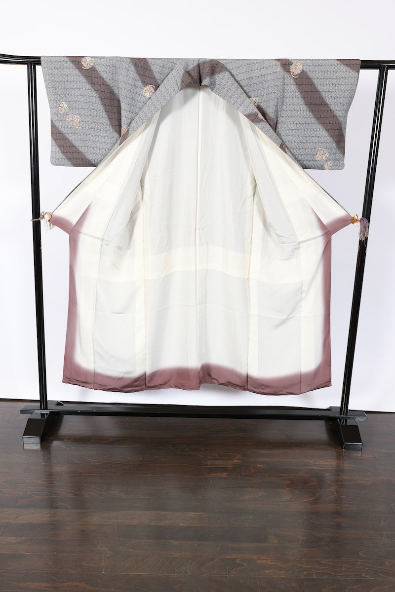 This lovely Edo Komon pattern is based on a stylish grey base with twisted plum and hollyhock designs dyed in an abstract, ombre style.