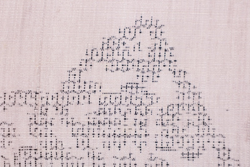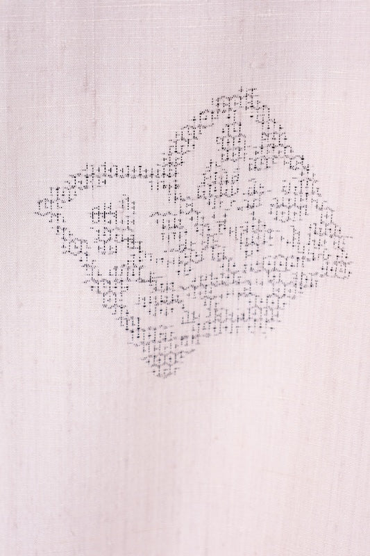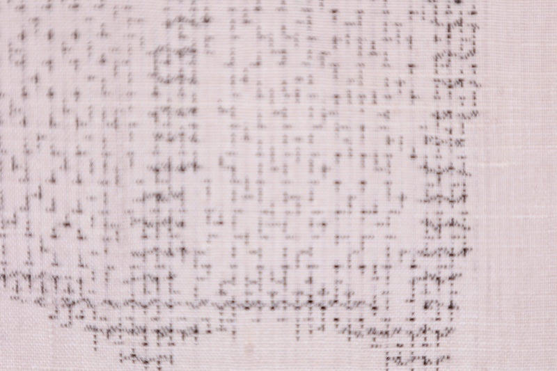 This beautiful kimono features a soft beige bunko pattern with an 80-meter tortoiseshell kasuri weave and is woven on a traditional Japanese loom.