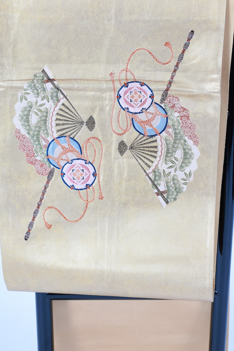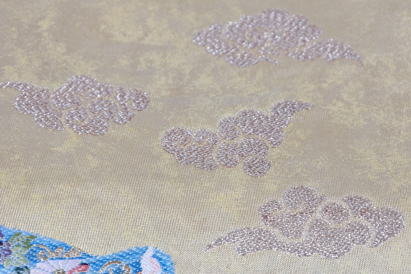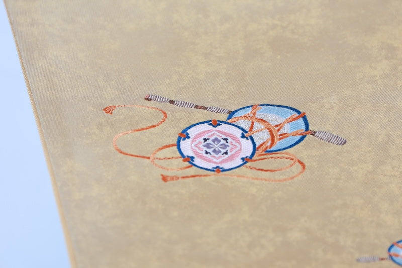 This beautiful item is made by drawing gold foil, cutting it into small pieces, and weaving it into auspicious patterns based on the Noh play Tsuchigumo.