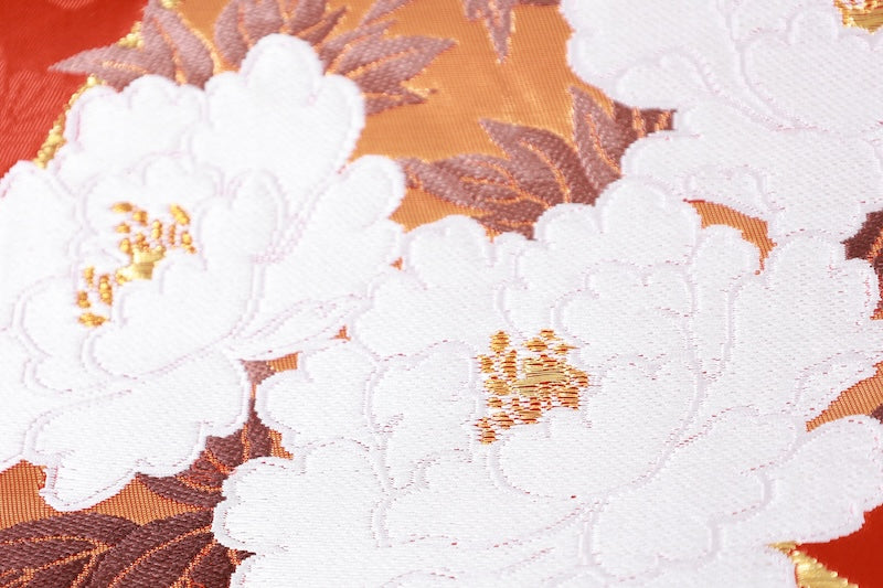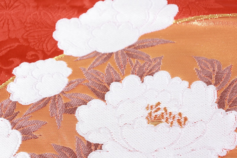 This is a lovely item with a stylish red base and fans and peonies woven into it.