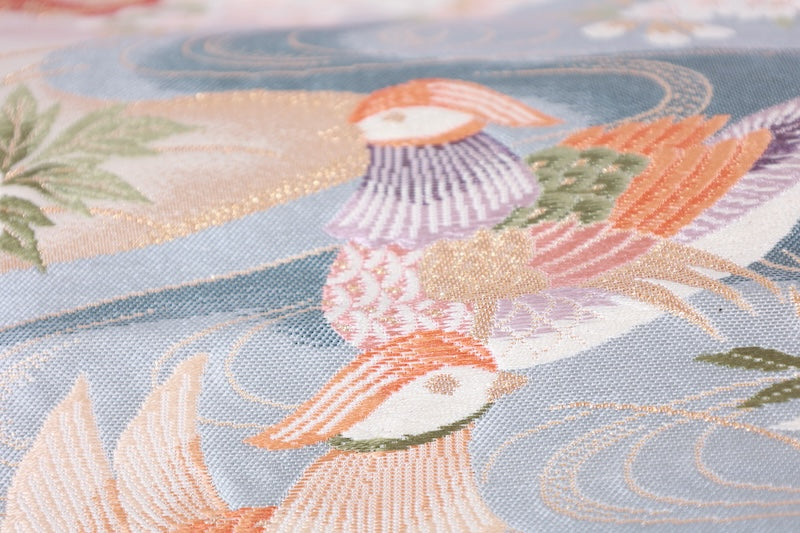 [Comments] This beautiful piece features a gold background and woven with mandarin ducks, flowers, pagodas, waves, and other unseen scenes.
