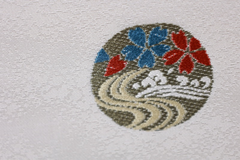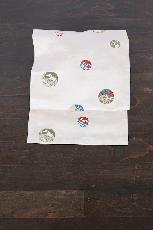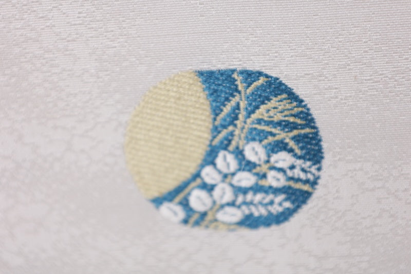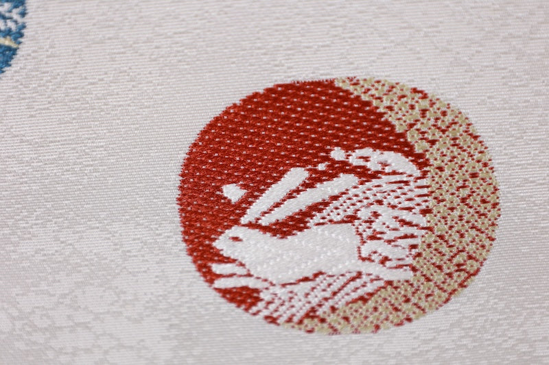 This is a lovely item with gentle coloring and woven rabbit, wave, and cloisonne patterns.