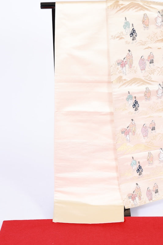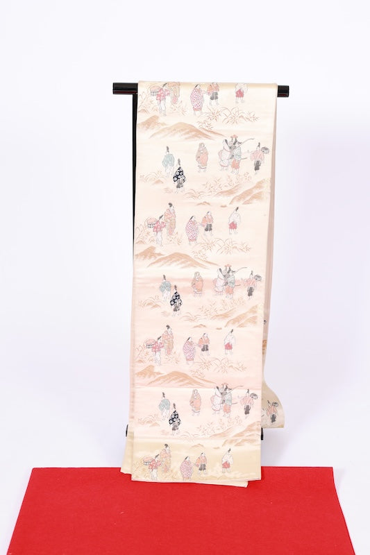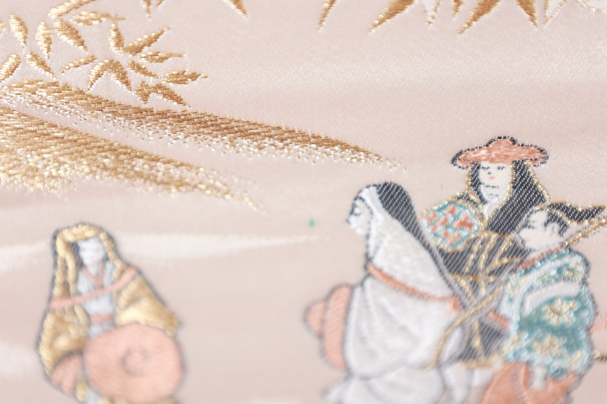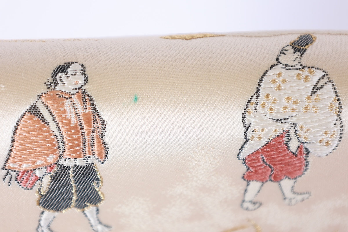 This is a beautiful piece, woven with a gold base and depicting the original landscape of the Heian period. There is a stain 5cm from the base, a stain 30cm above the dye 60cm from the base, and a stain 20cm above that. Please see the images. The stain is not visible on the obi drum, but it is visible at the tip of the base. It can also be used for display.